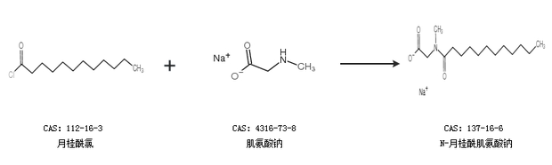 1.通過(guò)月桂酰氯和肌氨酸鈉合成N-月桂酰肌氨酸鈉