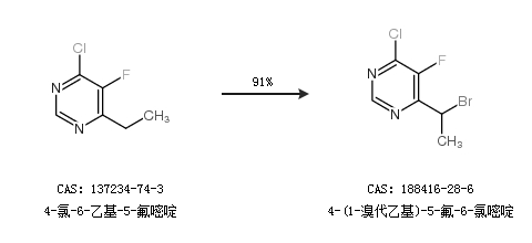 1.通過4-氯-6-乙基-5-氟嘧啶合成4-(1-溴代乙基)-5-氟-6-氯嘧啶,收率約91%;