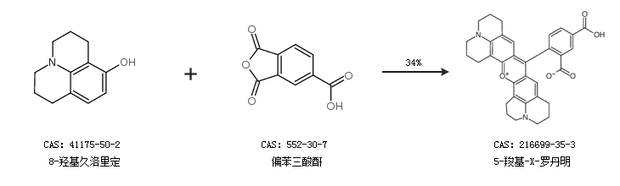 1.通過8-羥基久洛里定和偏苯三酸酐合成5-羧基-X-羅丹明,收率約34%;
