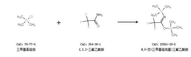 1.通過(guò)三甲基氯硅烷和2,2,2-三氟乙酰胺合成N,O-雙(三甲基硅烷基)三氟乙酰胺