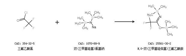 2.通過(guò)三氟乙酰氯和雙(三甲基硅基)氨基鈉合成N,O-雙(三甲基硅烷基)三氟乙酰胺