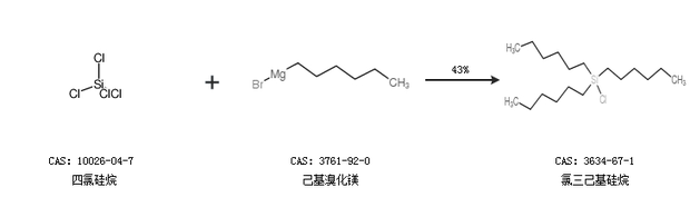 2.通過(guò)四氯硅烷和己基溴化鎂合成氯三己基硅烷,收率約43%;