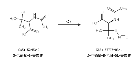 2.通過(guò)N-乙酰基-D-青霉胺合成S-亞硝基-N-乙酰-DL-青霉胺,收率約40%;
