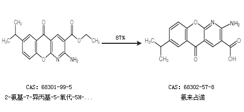 1.通過2-氨基-7-異丙基-5-氧代-5H-[1]苯并吡喃[2,3-b]吡啶-3-羧酸乙酯合成氨來占諾,收率約87%;