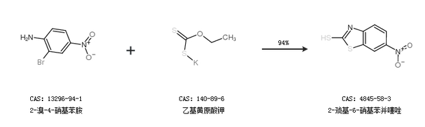 1.通過2-溴-4-硝基苯胺和乙基黃原酸鉀合成2-巰基-6-硝基苯并噻唑,收率約94%;