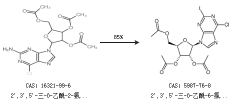 2.通過2'',3'',5''-三-O-乙酰-2-氨基-6-氯嘌呤核苷合成2'',3'',5''-三-O-乙酰-6-氯-2-碘嘌呤核苷,收率約85%;
