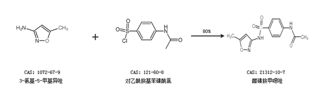 1.通過3-氨基-5-甲基異唑和對乙酰胺基苯磺酰氯合成醋磺胺甲噁唑,收率約80%;