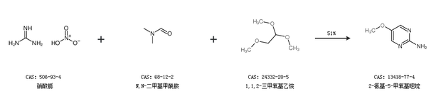 1.通過硝酸胍、N,N-二甲基甲酰胺和1,1,2-三甲氧基乙烷合成2-氨基-5-甲氧基嘧啶,收率約51%;