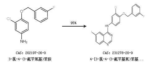 2.通過3-氯-4-(3-氟芐氧基)苯胺合成4-[3-氯-4-(3-氟芐基氧)苯基氨基]-6-碘喹唑啉,收率約95%;