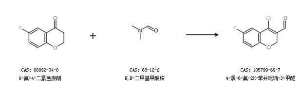 1.通過6-氟-4-二氫色原酮和N,N-二甲基甲酰胺合成4-氯-6-氟-2H-苯并吡喃-3-甲醛