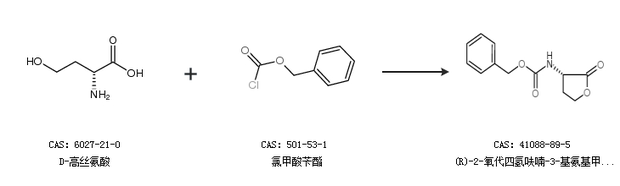1.通過(guò)D-高絲氨酸和氯甲酸芐酯合成(R)-2-氧代四氫呋喃-3-基氨基甲酸芐酯,收率約72%;