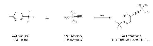 2.通過4-碘三氟甲苯和三甲基乙炔基硅合成1-[(三甲基硅基)乙炔基]-4-(三氟甲基)苯,收率約10%;