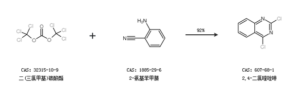 2.通過二(三氯甲基)碳酸酯和2-氨基苯甲腈合成2,4-二氯喹唑啉,收率約92%;