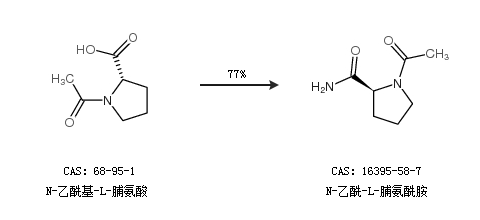 1.通過(guò)N-乙酰基-L-脯氨酸合成N-乙酰-L-脯氨酰胺,收率約77%;