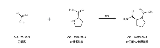 2.通過(guò)乙酰氯和L-脯氨酰胺合成N-乙酰-L-脯氨酰胺,收率約77%;