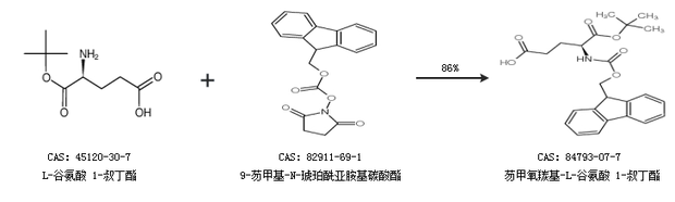 1.通過(guò)L-谷氨酸 1-叔丁酯和9-芴甲基-N-琥珀酰亞胺基碳酸酯合成芴甲氧羰基-L-谷氨酸 1-叔丁酯,收率約86%;