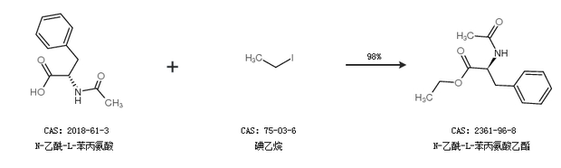 1.通過(guò)N-乙酰-L-苯丙氨酸和碘乙烷合成N-乙酰-L-苯丙氨酸乙酯,收率約98%;
