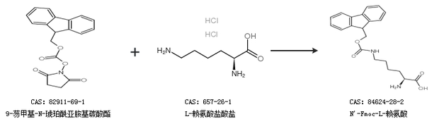 2.通過(guò)9-芴甲基-N-琥珀酰亞胺基碳酸酯和L-賴氨酸鹽酸鹽合成N''-Fmoc-L-賴氨酸