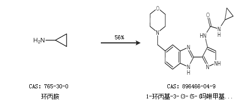 1.通過環(huán)丙胺合成1-環(huán)丙基-3-(3-(5-(嗎啉甲基)-1H-苯并[d]咪唑-2-基)-1H-吡唑-4-基)脲,收率約56%;