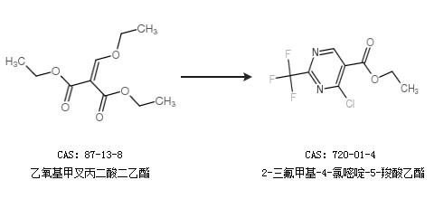 中文別名 4-氯-2-三氟甲基嘧啶-5-乙基羧酸鹽;2-三氟甲基-4-氯嘧啶-5-甲酸乙酯;2-三氟甲基-4-氯-5-嘧啶甲酸乙酯;4-氯-2-三氟甲基嘧啶-5-甲酸乙酯;