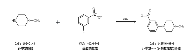 1.通過N-甲基哌嗪和間氟硝基苯合成1-甲基-4-(3-硝基苯基)哌嗪,收率約94%;