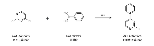 1.通過2,4-二氯嘧啶和苯硼酸合成4-苯基-2-氯嘧啶,收率約86%;