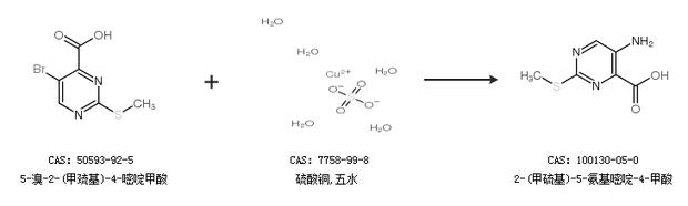 1.通過(guò)5-溴-2-(甲巰基)-4-嘧啶甲酸和硫酸銅,五水合成2-(甲硫基)-5-氨基嘧啶-4-甲酸