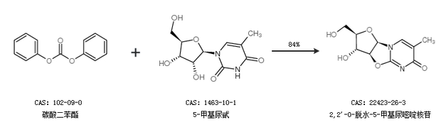 2.通過(guò)碳酸二苯酯和5-甲基尿甙合成2,2''-O-脫水-5-甲基尿嘧啶核苷,收率約84%;