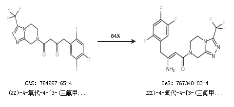 1.通過(2Z)-4-氧代-4-[3-(三氟甲基)-5,6-二氫-[1,2,4]三唑并[4,3-a]吡嗪-7-(8H)-基]-1-(2,4,5-三氟苯基)丁-2-酮合成(2Z)-4-氧代-4-[3-(三氟甲基)-5,6-二氫-[1,2,4]三唑并[4,3-a]吡嗪-7(8H)-基]-1-(2,4,5-三氟苯基)丁-2-烯-2-胺,收率約84%;