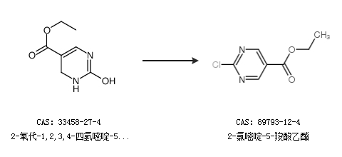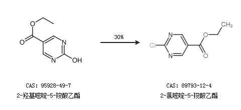 1.通過(guò)2-羥基嘧啶-5-羧酸乙酯合成2-氯嘧啶-5-羧酸乙酯,收率約30%;