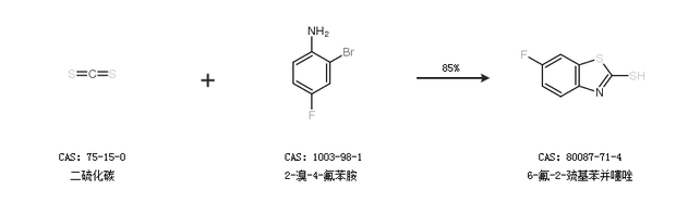 2.通過二硫化碳和2-溴-4-氟苯胺合成6-氟-2-巰基苯并噻唑,收率約85%;