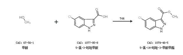 1.通過甲醇和5-氯-3-吲唑甲酸合成5-氯-1H-吲唑-3-甲酸甲酯,收率約74%;