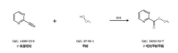 1.通過(guò)2-氰基嘧啶和甲醇合成2-嘧啶甲酸甲酯,收率約81%;