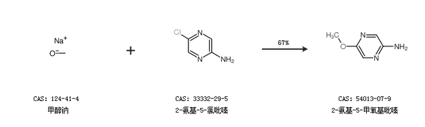 1.通過(guò)甲醇鈉和2-氨基-5-氯吡嗪合成2-氨基-5-甲氧基吡嗪,收率約67%;