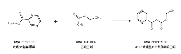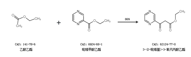 1.通過乙酸乙酯和吡嗪甲酸乙酯合成3-(2-吡嗪基)-3-氧代丙酸乙酯,收率約86%;