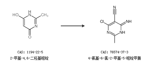 2.通過(guò)2-甲基-4,6-二羥基嘧啶合成4-氨基-6-氯-2-甲基-5-嘧啶甲腈