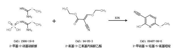 1.通過2-甲基-2-疏基硫酸脲和2-氰基-3-乙氧基丙烯酸乙酯合成2-甲硫基-4-羥基-5-氰基嘧啶,收率約63%;