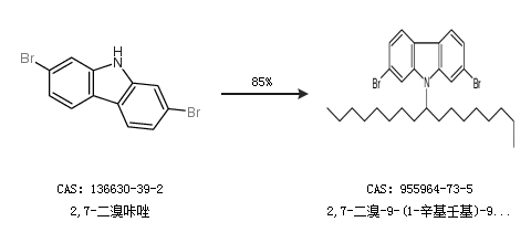 1.通過2,7-二溴咔唑合成2,7-二溴-9-(1-辛基壬基)-9H-咔唑,收率約85%;