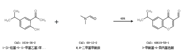 1.通過(guò)1-[2-羥基-5-(1-甲基乙基)苯基]乙酮和N,N-二甲基甲酰胺合成3-甲;-6-異丙基色酮,收率約49%;