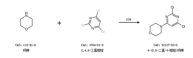 2.通過嗎啉和2,4,6-三氯嘧啶合成4-(2,6-二氯-4-嘧啶)嗎啉,收率約23%;