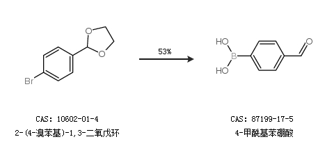 2.通過(guò)2-(4-溴苯基)-1,3-二氧戊環(huán)合成4-甲;脚鹚幔章始s53%;