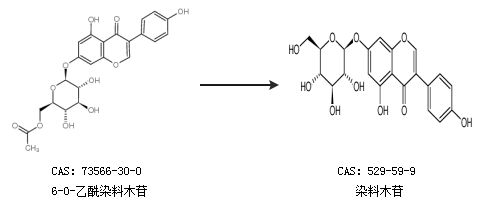 帶黃色針狀晶體(由稀乙醇重結(jié)晶),熔點265℃,不溶于水,稍溶于熱水,遇三氯化鐵,先呈血紅色,后變紅紫色,以醇態(tài)稀鹽酸于熱時進行水解;得異染料木黃酮及1分子葡萄糖,本品為存在于大豆Soya hispi-da中的一種異黃酮苷,由萃取而得,用作試劑。