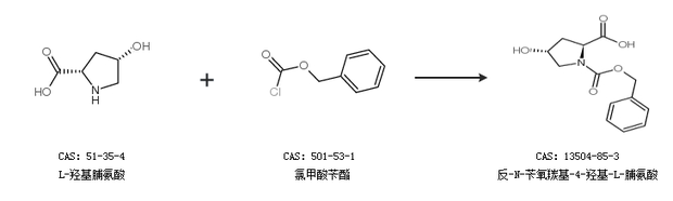 1.通過L-羥基脯氨酸和氯甲酸芐酯合成反-N-芐氧羰基-4-羥基-L-脯氨酸,收率約99%;