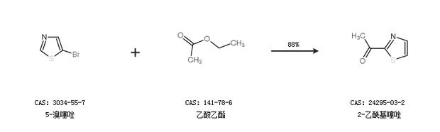 1.通過5-溴噻唑和乙酸乙酯合成2-乙酰基噻唑,收率約88%;