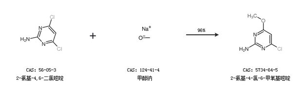 1.通過(guò)2-氨基-4,6-二氯嘧啶和甲醇鈉合成2-氨基-4-氯-6-甲氧基嘧啶,收率約96%;