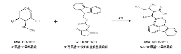 2.通過N-甲基-L-異亮氨酸和9-芴甲基-N-琥珀酰亞胺基碳酸酯合成Fmoc-N-甲基-L-異亮氨酸,收率約45%;