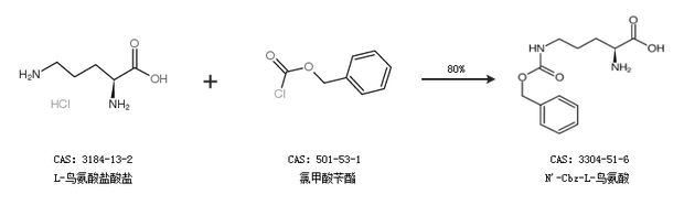 1.通過L-鳥氨酸鹽酸鹽和氯甲酸芐酯合成N''-Cbz-L-鳥氨酸,收率約80%;