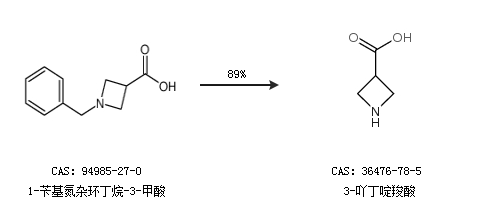 1.通過(guò)1-芐基氮雜環(huán)丁烷-3-甲酸合成3-吖丁啶羧酸,收率約89%;