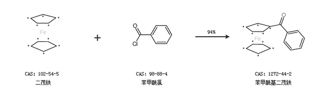 1.通過二茂鐵和苯甲酰氯合成苯甲?;F,收率約94%;