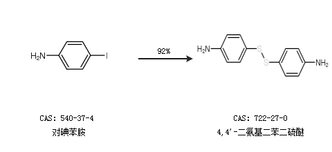 1.通過對碘苯胺合成4,4''-二氨基二苯二硫醚,收率約92%;